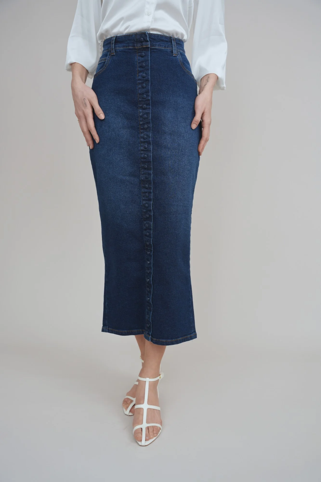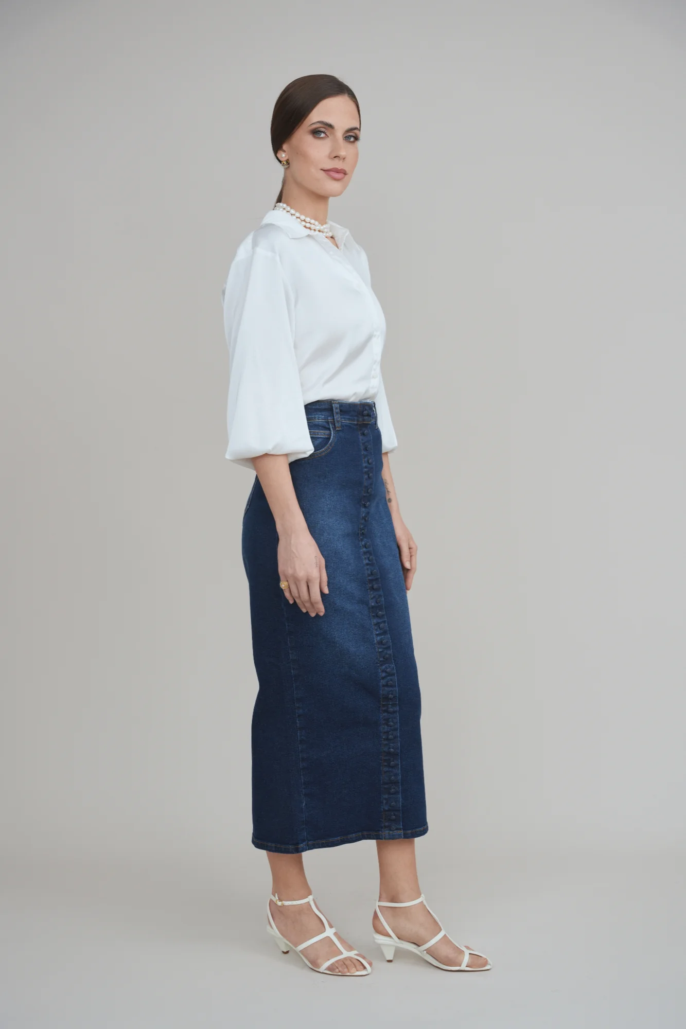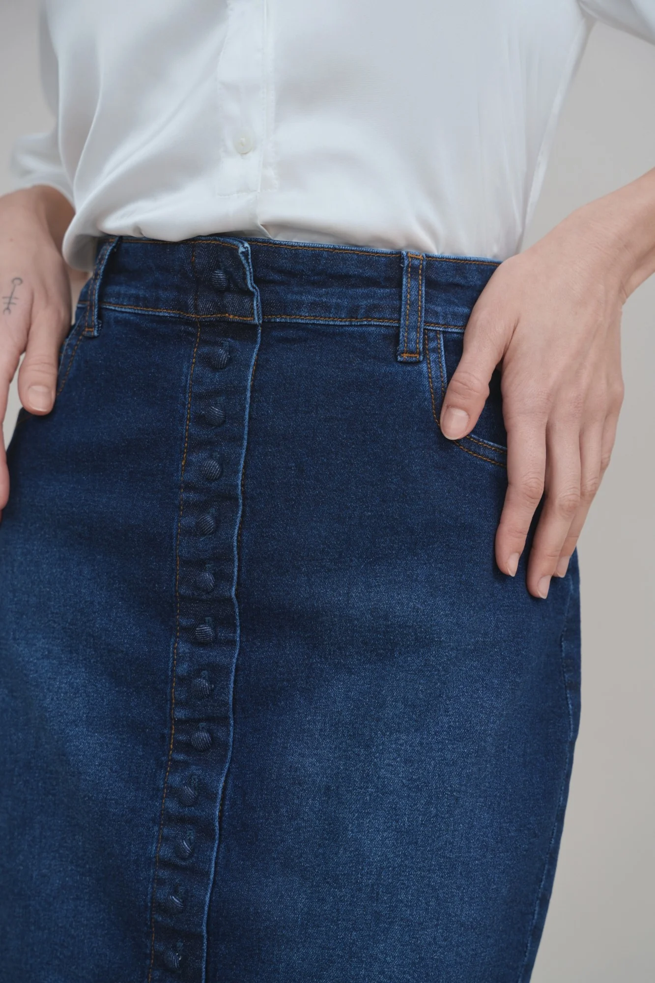The Sweeney Dark Blue Stretch Denim Skirt moves with quiet confidence; a soft silhouette shaped from exquisite Peruvian stretch denim in a serene sky-blue wash. Designed for comfort, structure, and timeless wear, it features a concealed side zipper for ease and a smooth fit. Its buttons are for decorative purposes only