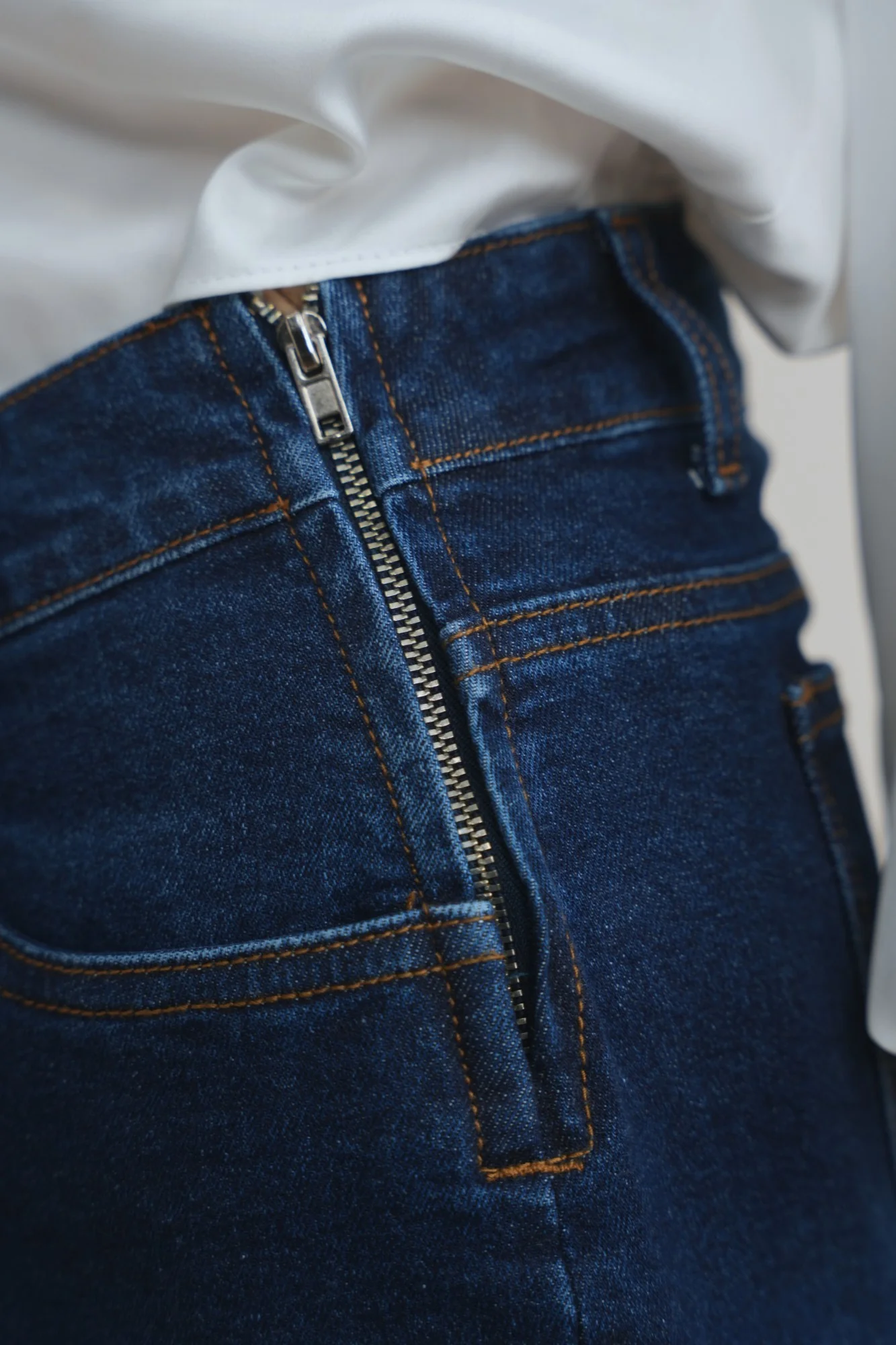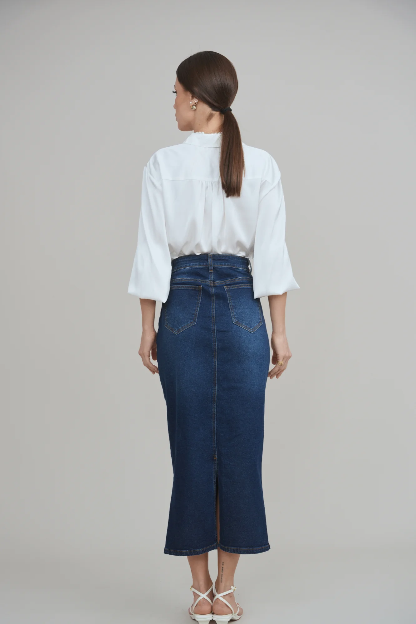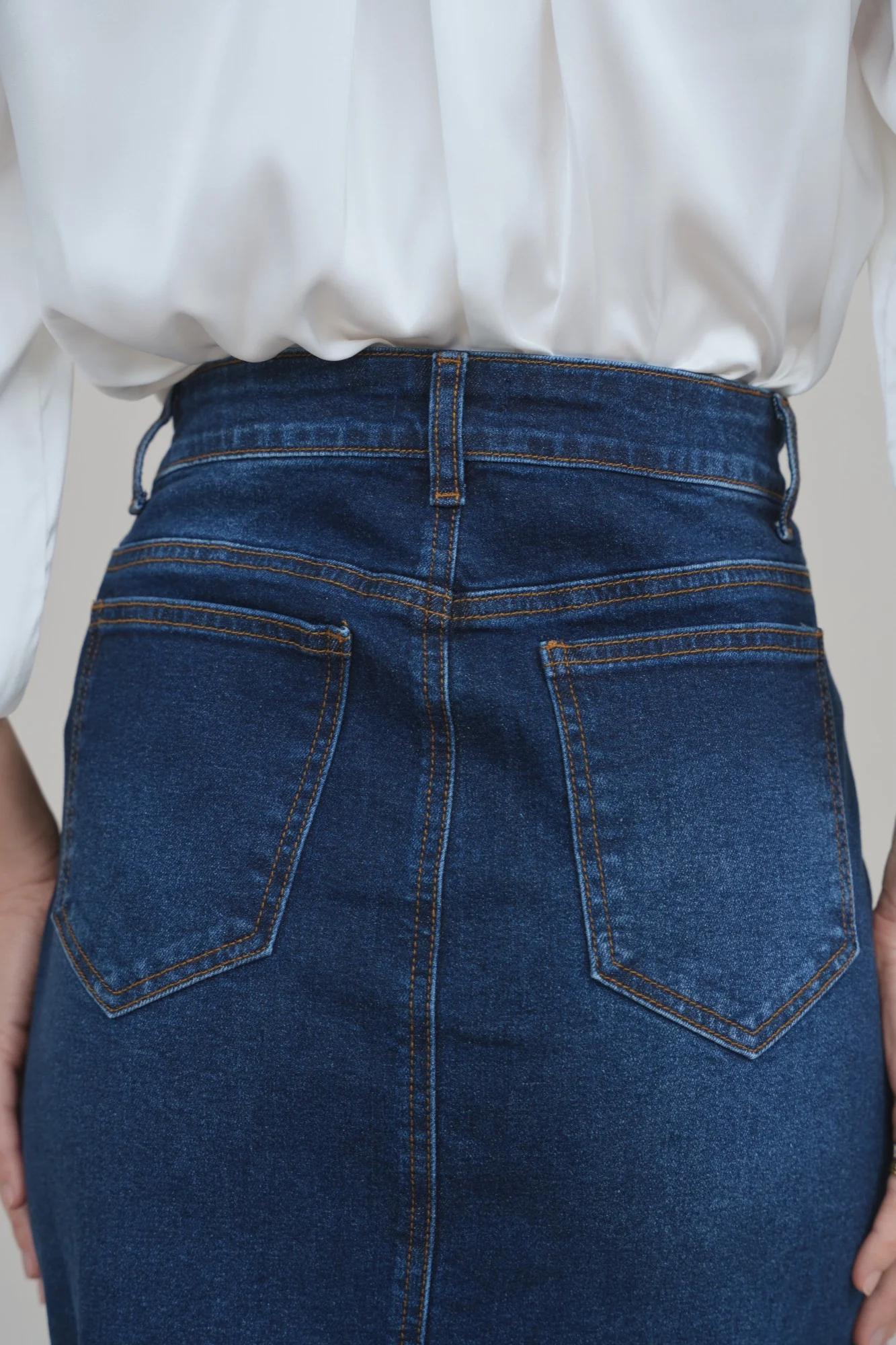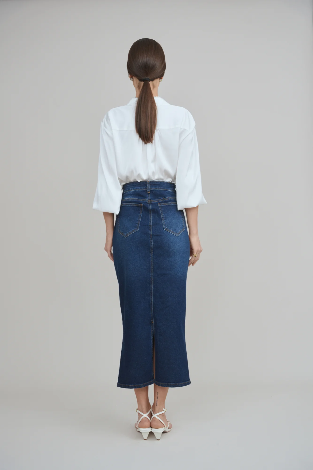 The Sweeney Dark Blue Stretch Denim Skirt moves with quiet confidence; a soft silhouette shaped from exquisite Peruvian stretch denim in a serene sky-blue wash. Designed for comfort, structure, and timeless wear, it features a concealed side zipper for ease and a smooth fit. Its buttons are for decorative purposes only