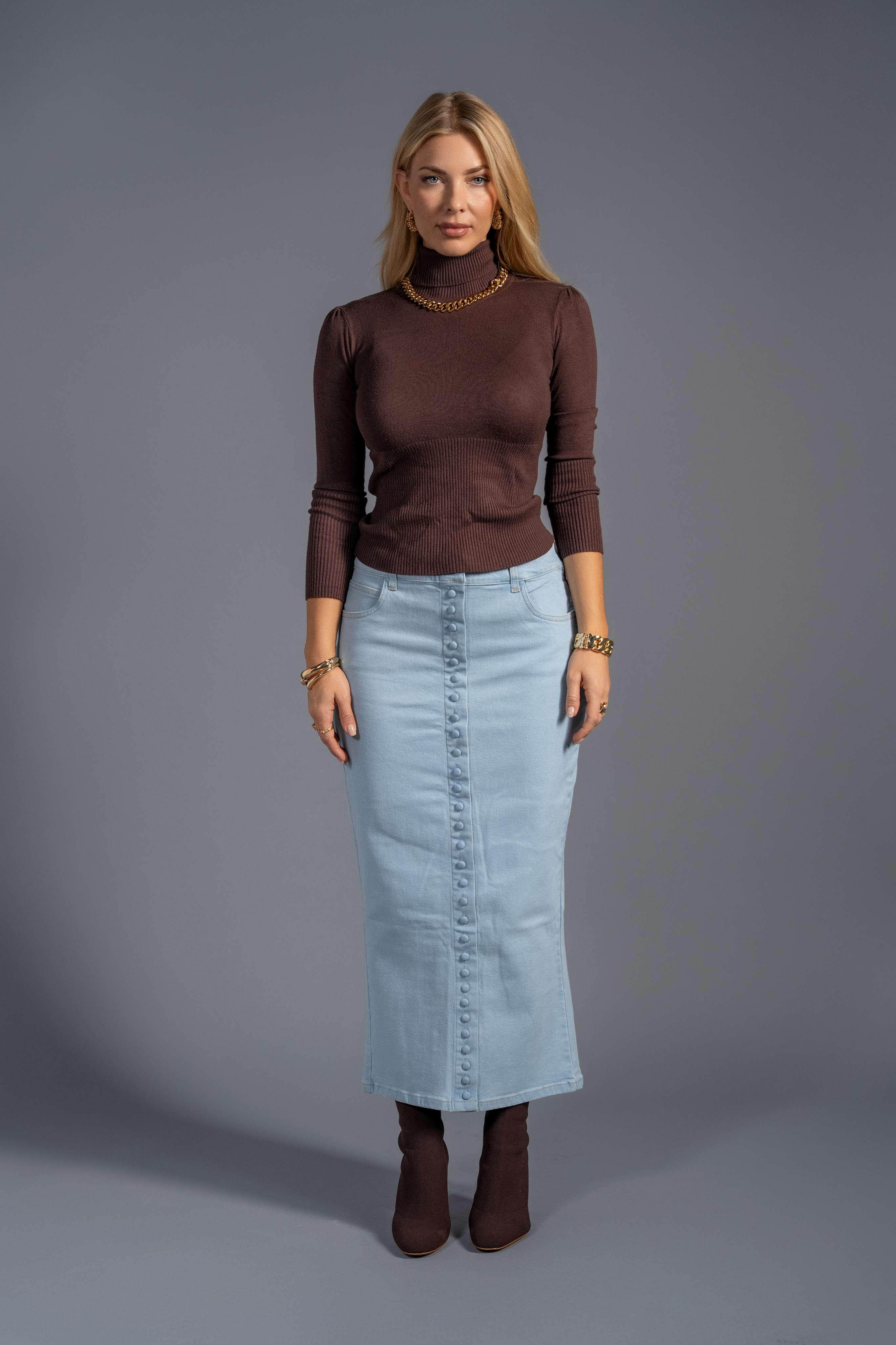 The Sky Blue Stretch Denim Skirt moves with quiet confidence; a soft silhouette shaped from exquisite Peruvian stretch denim in a serene sky-blue wash. Designed for comfort, structure, and timeless wear, it features a concealed side zipper for ease and a smooth fit. Its buttons are for decorative purposes only, ensurin