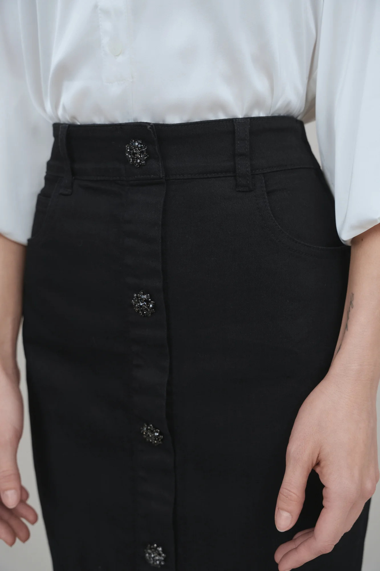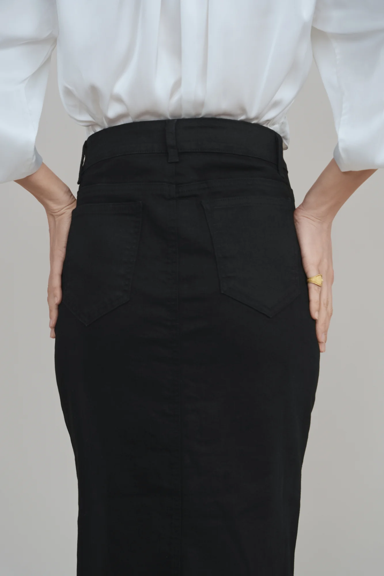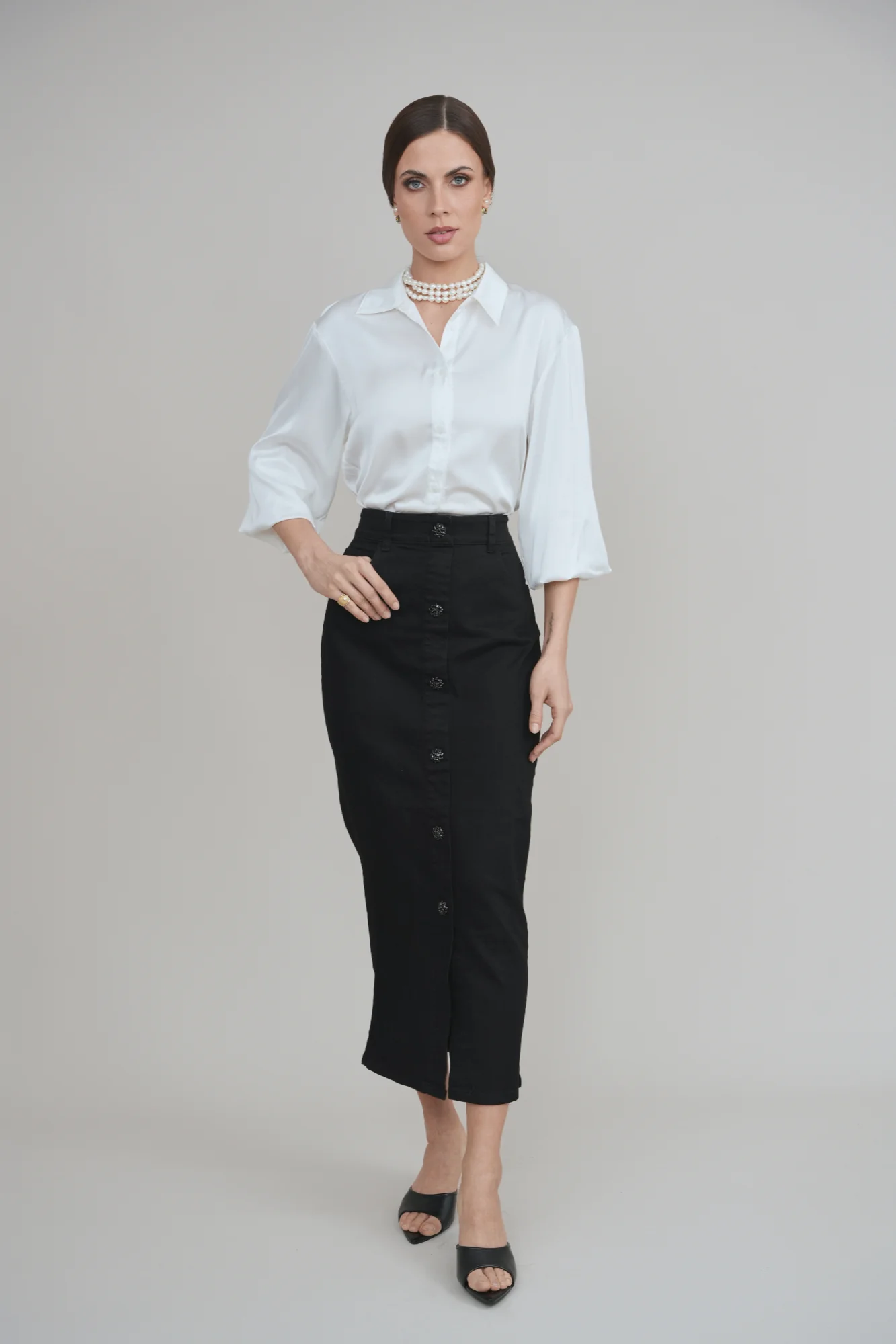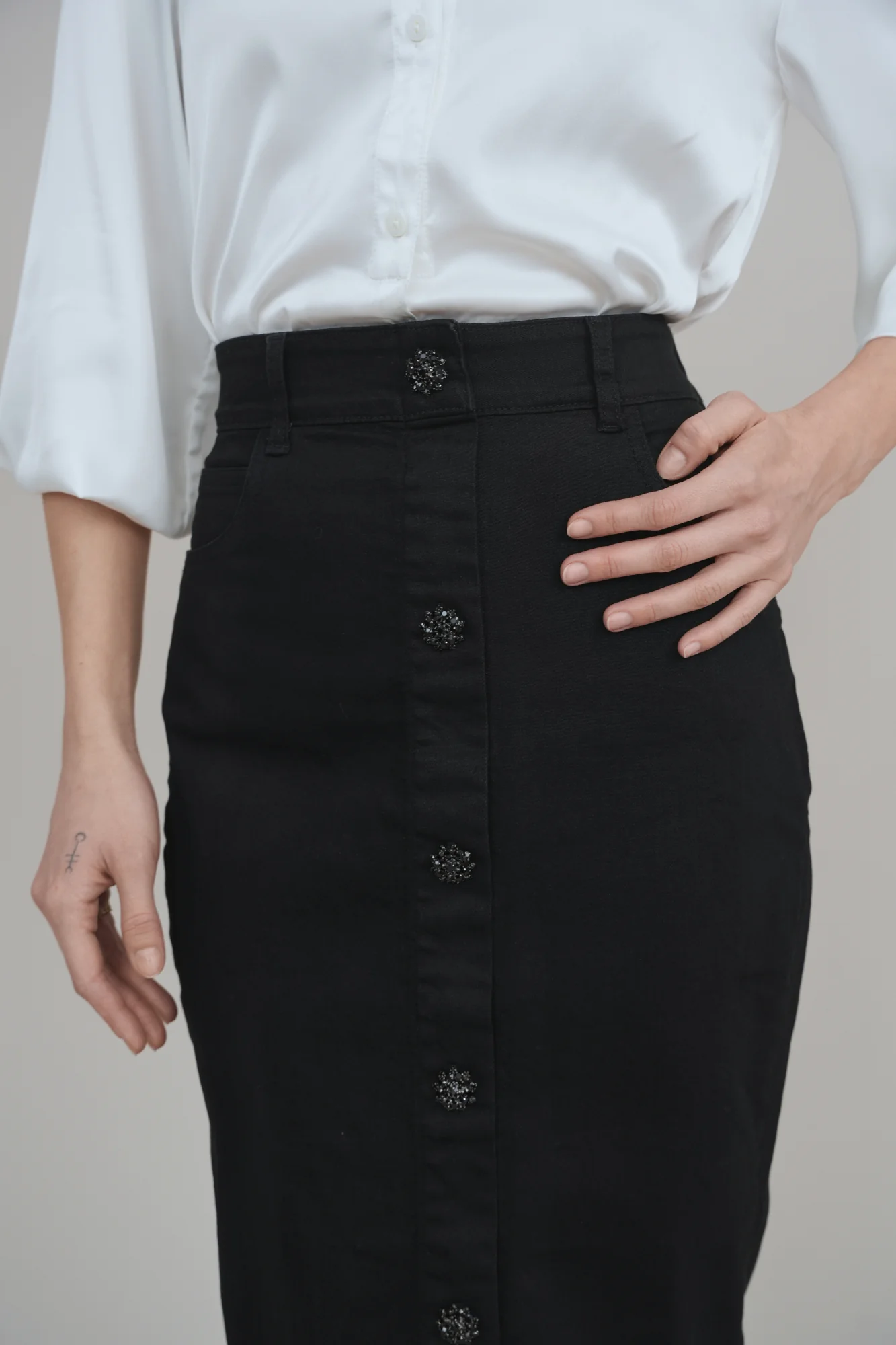 Crafted from rich black Peruvian Cotton stretch denim, the Black Diamond Skirt embodies understated power. Its silhouette holds form without rigidity, moving as you move: grounded, poised, unshaken. A side zipper ensures a seamless fit, while decorative buttons glint softly along the front, a quiet detail that symbolizes strength polished by experience. A wardrobe constant for the woman who wears her resilience with elegance.